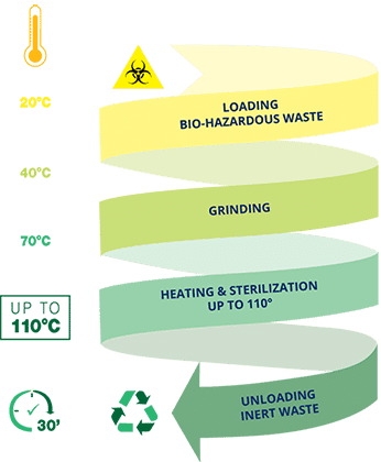 Through a fully automated 30-minute cycle in one single vessel and a rapid and efficient temperature rise up to 110 ° C, Sterilwave transforms infectious waste into decontaminated municipal waste.